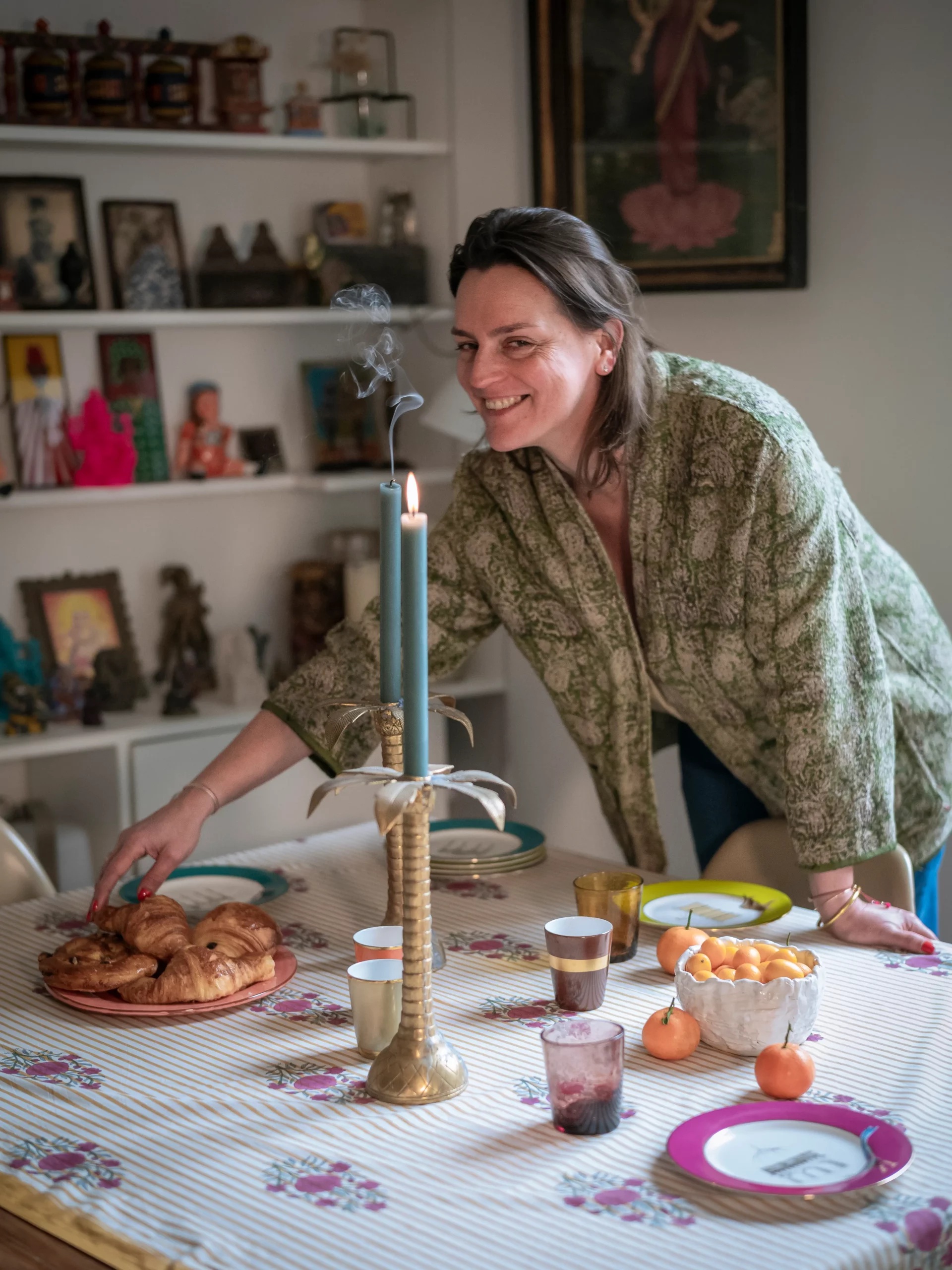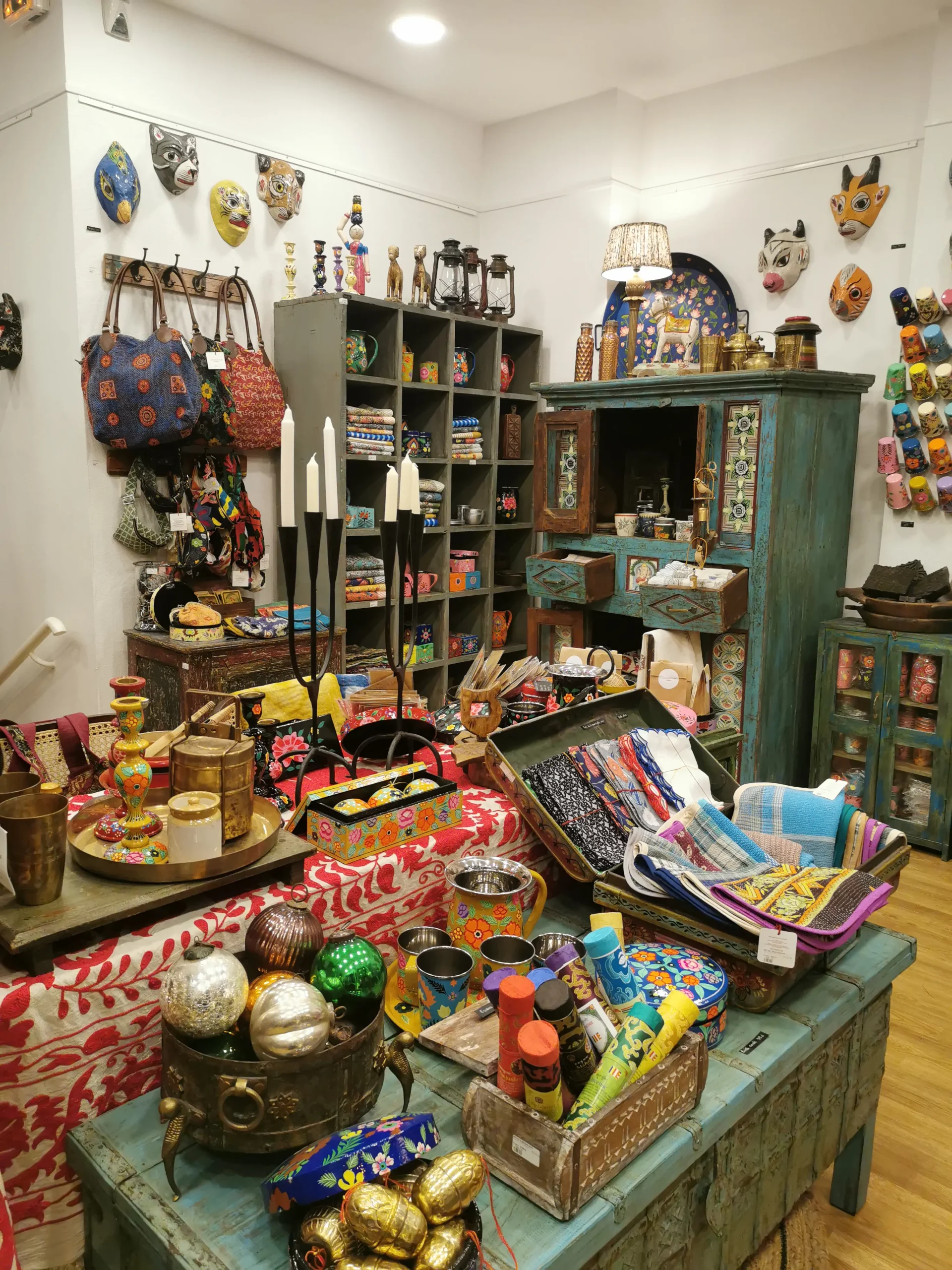 Dès l’entrée, ce sont les couleurs qui attirent : du bleu celadon, du rose fushia, du jaune soleil… et une multitude d’objets de déco qui confèrent une touche gaie et exotique à un intérieur. La créatrice des lieux, Emeline Grasset, nous apprend qu’elle connait bien l’Inde pour y avoir résidé pendant 20 ans.